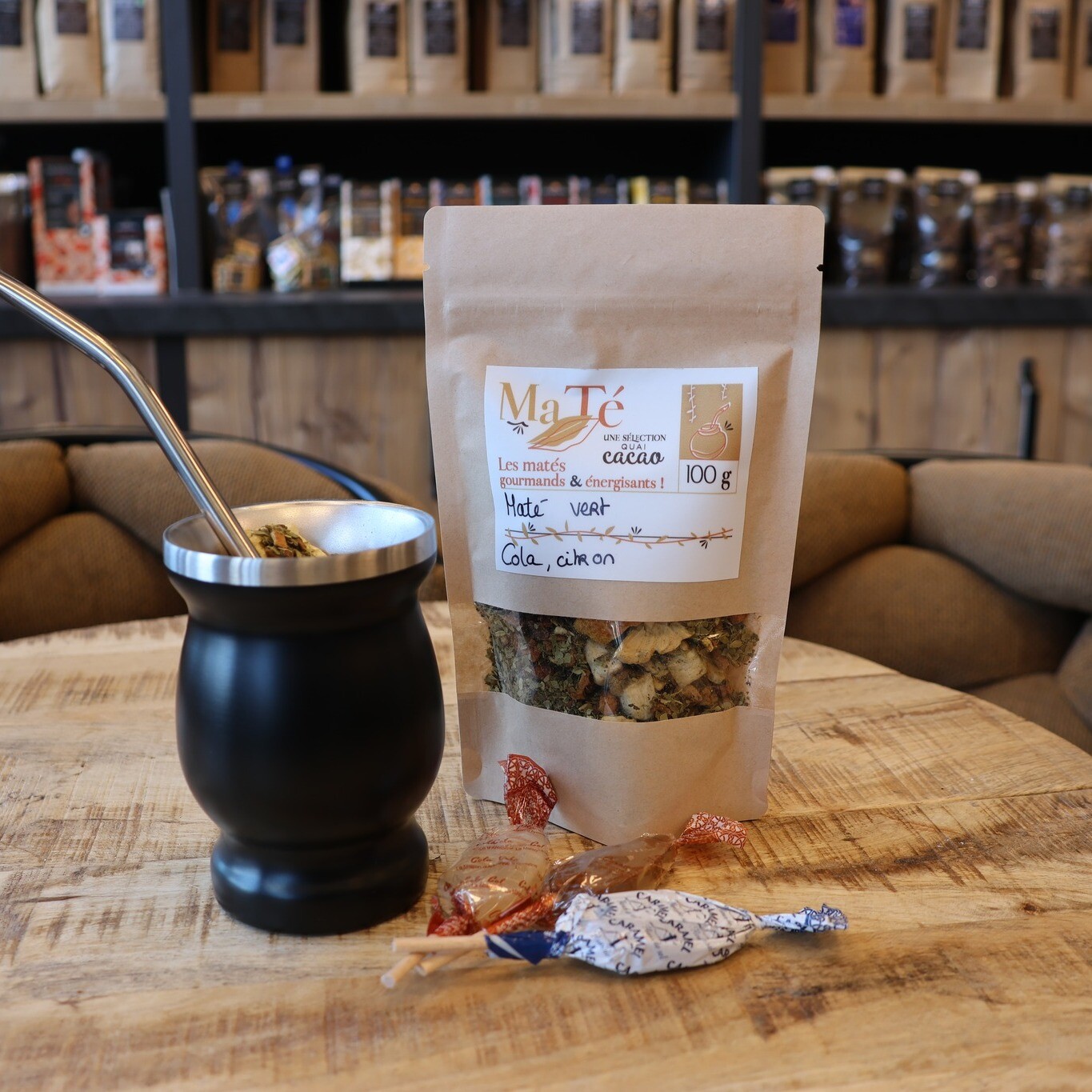 Nous vous proposons un maté vert cola-citron, une infusion simple à préparer, idéale pour apporter un peu d’énergie dans la journée. Son caractère frais accompagne facilement une pause, seule ou en complément d’une gourmandise.